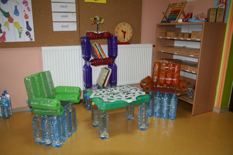 Materiały:kartony, butelki małe i duże, bibuła,