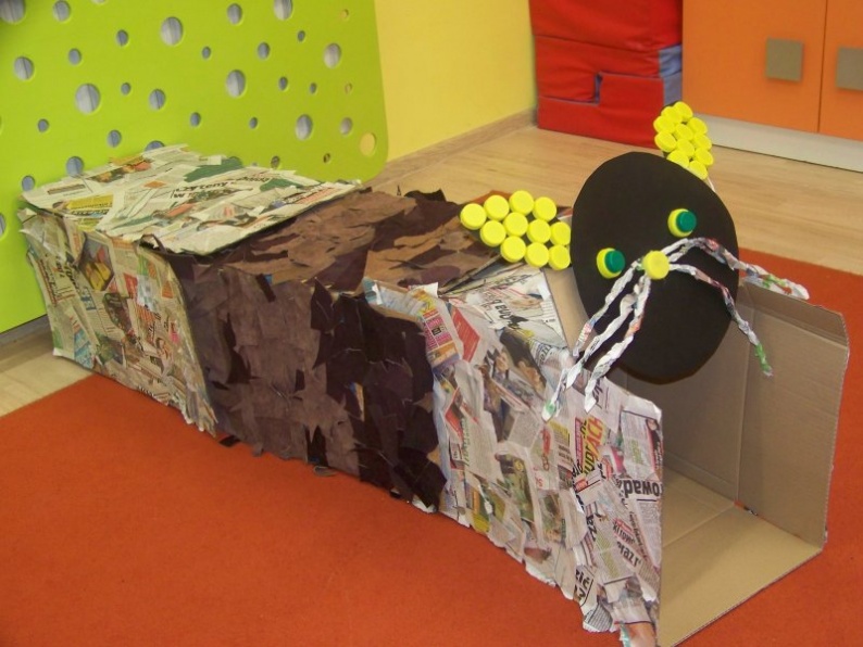 Materiały:kartony, gazety, plastikowe nakrętki,