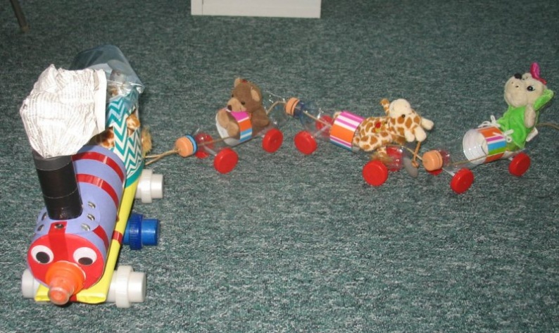 Opis pracy:Naucz. wycięła w butelkach po 2 otwory.Dzieci okleiły miejsca po naklejce,do wagonów dołączyły koła-zakrętki po mleku,wagony połączyły sznurkiem.Okleiły szpulki brystolem,połączyły,klejem,ozdobiły pnezkami.Do komina włożyły kawałek gazety imitującej dym.